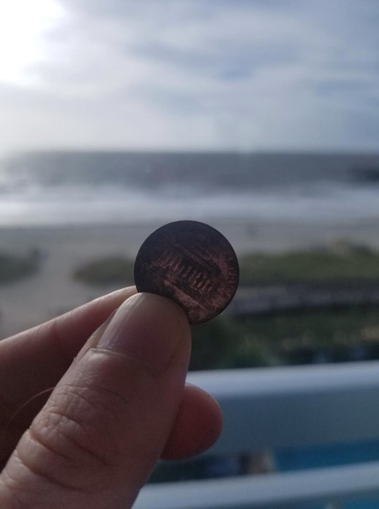 We went for an early morning walk on the beach. I had what I call a “mom moment”. My mom has been sharing her early morning walks and talks with the Lord. On my walk today I was looking at the waves and the shells and thought of how sea glass is my favorite. I then heard how sea glass gets that way after weather the waves and the storms of life much like we do. All that we go through shapes us into beauty. At that moment I looked down and found this penny. God still talks to us, we just need to listen. Have a Blessed day 💗💗